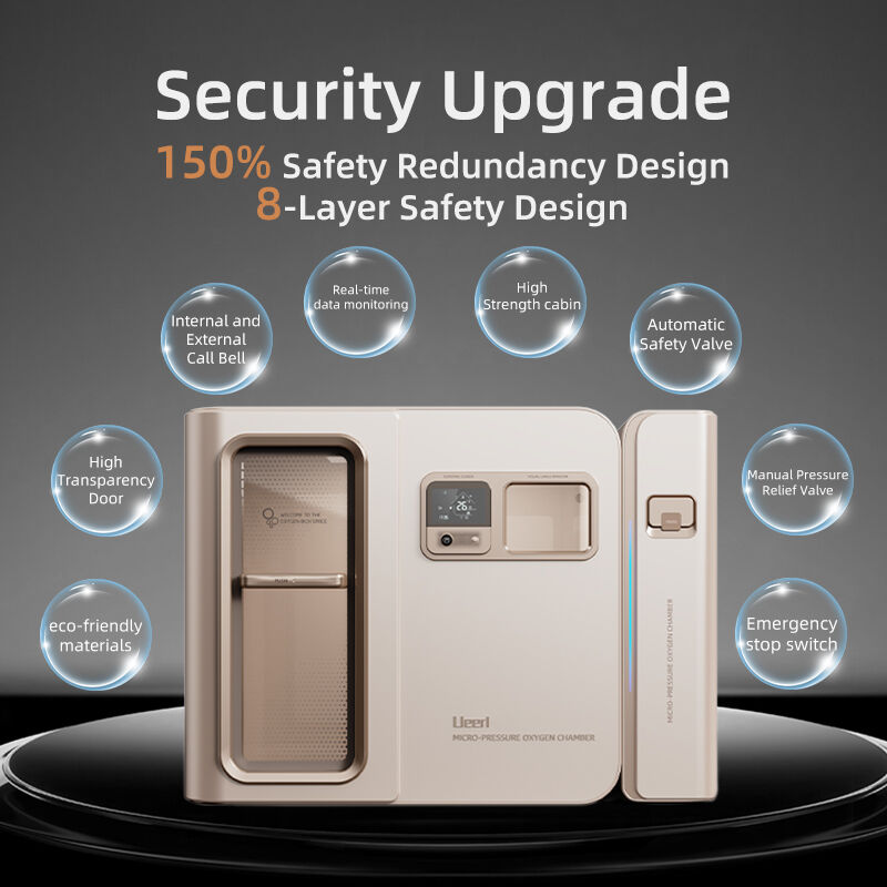 Safety is ensured with 8-layer protection: lockless door, 3 automatic and manual safety valves, manual reset, over-pressure shutdown, real-time monitoring, and flame-retardant materials—making this hyperbaric chamber your reliable wellness partner.